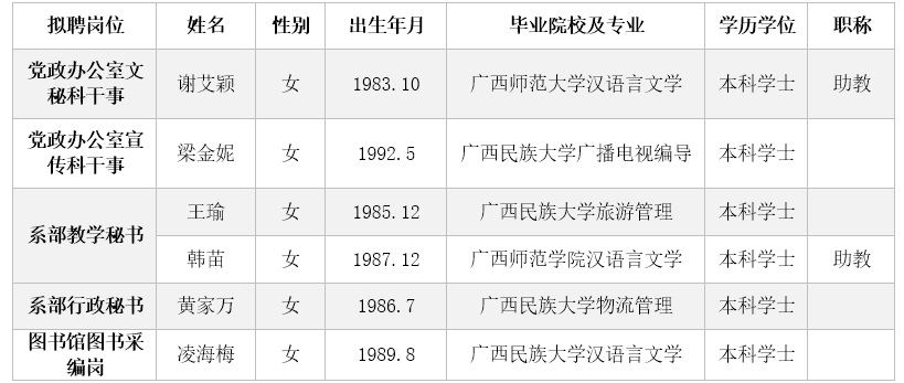 根据《关于印发< 广西壮族自治区事业单位公开招聘人员实施办法>的通知》(桂人社发[2011]155号)及《betway西汉姆联官网2018年冬季公开招聘非实名制人员公告》的有关规定,通过报名、资格审查、考试、考核、体检等程序,经研究决定,拟聘谢艾颖等6位同志为西汉姆联工作人员。现将拟聘用人员名单予以公示,公示时间为2019年1月26日-2019年2月5日,如有异议,请于2月5日下午5:00前以书面形式并署真实姓名反馈到学校纪委或组织人事处。联系地址:广西南宁市大学东路91号,邮政编码:530007,联系电话:0771—3240084,0771—3278961。
