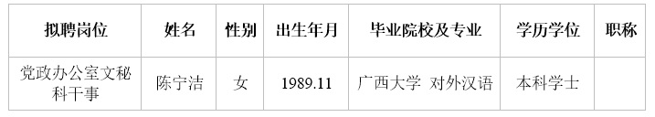 根据《关于印发< 广西壮族自治区事业单位公开招聘人员实施办法>的通知》(桂人社发[2011]155号)及《betway西汉姆联官网2018年冬季公开招聘非实名制人员公告》的有关规定,通过报名、资格审查、考试、考核、体检等程序,经研究决定,拟聘陈宁洁同志为西汉姆联工作人员。现将拟聘用人员名单予以公示,公示时间为2019年2月9日-2019年2月19日,如有异议,请于2月19日下午5:00前以书面形式并署真实姓名反馈到学校纪委或组织人事处。联系地址:广西南宁市大学东路91号,邮政编码:530007,联系电话:0771—3240084,0771—3278961。