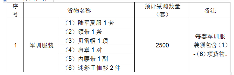 1.项目概况:本项目是betway西汉姆联官网军训服装采购项目,预计采购2500套军训服装,每套军训服装包含陆军夏服、迷彩服、贝雷帽等6项货物;