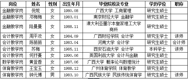 现将拟录用人员基本情况予以公示,公示时间为8月19日-8月27日,如有异议,请于8月27日下午5:00前以书面形式并署真实姓名反馈到学院纪委或组织人事处。联系地址:广西南宁市大学东路91号,邮政编码:530007,联系电话:0771—3240084,0771—3278961。