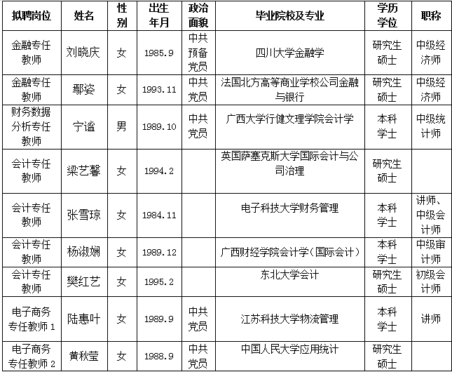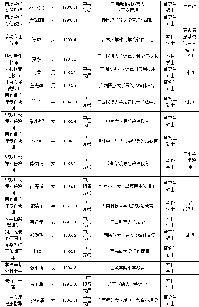 根据《关于印发<广西壮族自治区事业单位公开招聘人员实施办法>的通知》(桂人社发[2011]155号)及《betway西汉姆联官网2021年第一批公开招聘非实名人员控制数工作人员公告》的有关规定,通过报名、资格审查、考试、考核、体检等程序,经研究决定,拟聘刘晓庆等42位同志为我院工作人员。现将拟聘用人员名单予以公示,公示时间为2021年11月30日-2021年12月8日,如有异议,请于12月8日下午5:00前以书面形式并署真实姓名反馈到学院纪委或组织人事处。联系地址:广西南宁市大学西路168号,邮政编码:530007,联系电话:0771—3481676,0771—3481779。