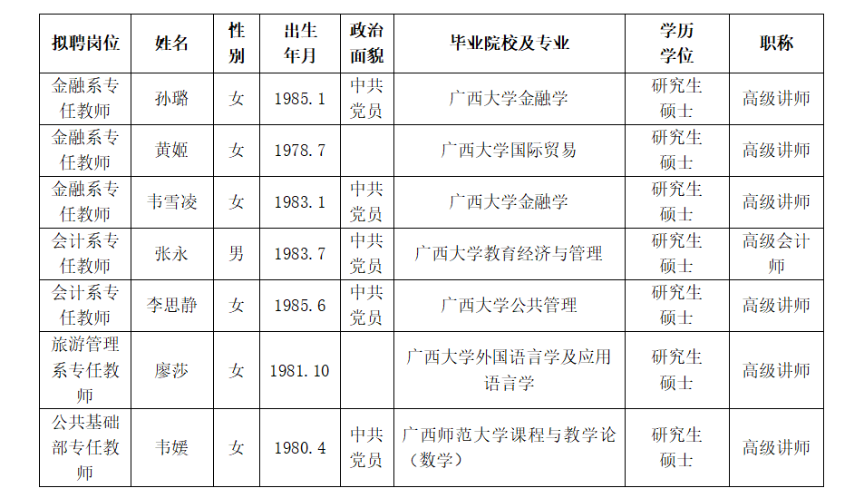 根据《关于印发<广西壮族自治区事业单位公开招聘人员实施办法>的通知》(桂人社发〔2011〕155号)及《betway西汉姆联官网2022年秋季公开招聘高级职称人才公告》的有关规定,通过报名、资格审查、考试、考核、体检等程序,经研究决定,拟聘孙璐等7位同志为我院工作人员。现将拟聘用人员名单予以公示,公示时间为2023年1月20日-2023年1月26日,如有异议,请于1月26日下午5:00前以书面形式并署真实姓名反馈到学院纪委或组织人事处。联系地址:广西南宁市大学西路168号,邮政编码:530007,联系电话:0771—3481338,0771—3481779。
