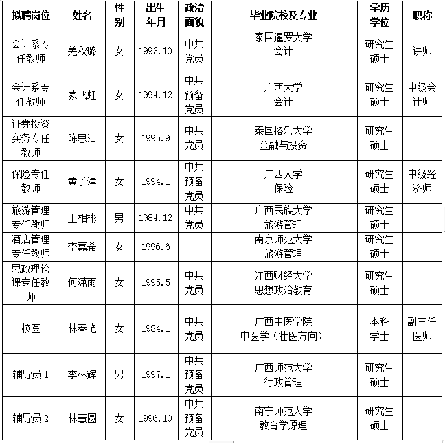 根据《关于印发<广西壮族自治区事业单位公开招聘人员实施办法>的通知》(桂人社发[2011]155号)及《betway西汉姆联官网2023年第一批公开招聘非实名人员控制数工作人员公告》的有关规定,通过报名、资格审查、考试、考核、体检等程序,经研究决定,拟聘羌秋璐等10位同志为我院工作人员。现将拟聘用人员名单予以公示,公示时间为2023年5月17日-2023年5月23日,如有异议,请于5月23日下午5:00前以书面形式并署真实姓名反馈到学院纪委或组织人事处。联系地址:广西南宁市大学西路168号,邮政编码:530007,联系电话:0771—3481338,0771—3481779。