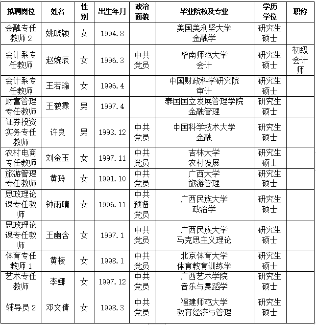 根据《关于印发<广西壮族自治区事业单位公开招聘人员实施办法>的通知》(桂人社发[2011]155号)及《betway西汉姆联官网2023年第一批公开招聘非实名人员控制数工作人员公告》的有关规定,通过报名、资格审查、考试、考核、体检等程序,经研究决定,拟聘姚晓颖等12位同志为我院工作人员。现将拟聘用人员名单予以公示,公示时间为2023年5月23日-2023年5月29日,如有异议,请于5月29日下午5:00前以书面形式并署真实姓名反馈到学院纪委或组织人事处。联系地址:广西南宁市大学西路168号,邮政编码:530007,联系电话:0771—3481338,0771—3481779。