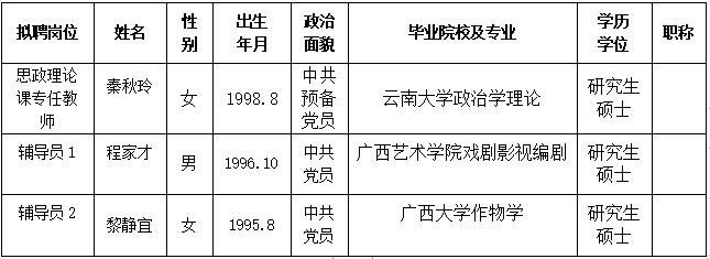 根据《关于印发<广西壮族自治区事业单位公开招聘人员实施办法>的通知》(桂人社发[2011]155号)及《betway西汉姆联官网2023年第一批公开招聘非实名人员控制数工作人员公告》的有关规定,通过报名、资格审查、考试、考核、体检等程序,经研究决定,拟聘秦秋玲等3位同志为我院工作人员。现将拟聘用人员名单予以公示,公示时间为2023年6月20日-2023年6月26日,如有异议,请于6月26日下午5:00前以书面形式并署真实姓名反馈到学院纪委或组织人事处。联系地址:广西南宁市大学西路168号,邮政编码:530007,联系电话:0771—3481338,0771—3481779。