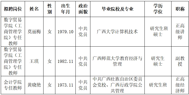 根据《关于印发<广西壮族自治区事业单位公开招聘人员实施办法>的通知》(桂人社发〔2011〕155号)及《betway西汉姆联官网高层次人才引进公告》的有关规定,通过报名、资格审查、考核、体检等程序,经研究决定,拟聘莫丽梅等3位同志为西汉姆联高层次人才。现将拟聘用人员名单予以公示,公示时间为2024年5月7日-2024年5月13日,如有异议,请于2024年5月13日下午5:00前以书面形式并署真实姓名反馈到学校纪委或人事处。联系地址:广西南宁市大学西路168号,邮政编码:530007,联系电话:0771—3481338,0771—3481779。