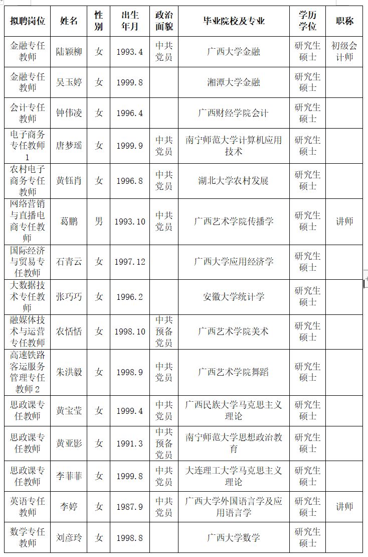 根据《关于印发<广西壮族自治区事业单位公开招聘人员实施办法>的通知》(桂人社发〔2011〕155号)及《betway西汉姆联官网2024年第一批公开招聘非实名人员控制数工作人员公告》的有关规定,通过报名、资格审查、考试、考核、体检等程序,经研究决定,拟聘陆颖柳等22位同志为西汉姆联工作人员。现将拟聘用人员名单予以公示,公示时间为2024年6月13日-2024年6月19日,如有异议,请于2024年6月19日下午5:00前以书面形式并署真实姓名反馈到学校纪委或人事处。联系地址:广西南宁市大学西路168号,邮政编码:530007,联系电话:0771—3481338,0771—3481779。