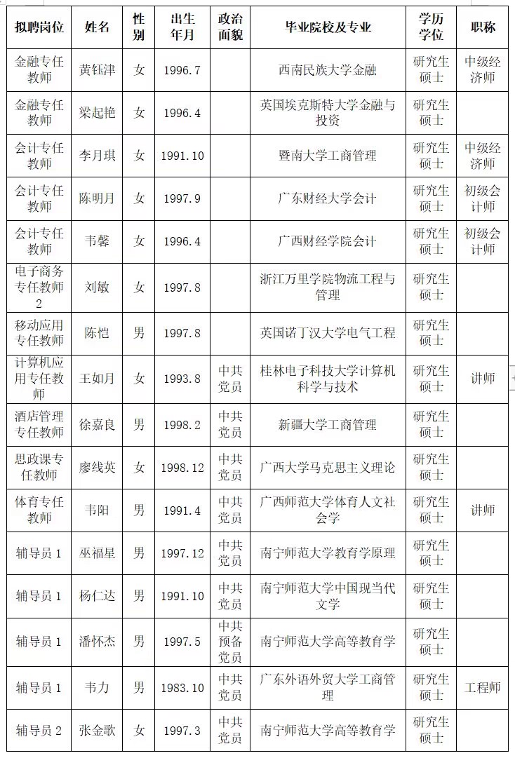 根据《关于印发<广西壮族自治区事业单位公开招聘人员实施办法>的通知》(桂人社发〔2011〕155号)及《betway西汉姆联官网2024年第一批公开招聘非实名人员控制数工作人员公告》的有关规定,通过报名、资格审查、考试、考核、体检等程序,经研究决定,拟聘黄钰津等19位同志为西汉姆联工作人员。现将拟聘用人员名单予以公示,公示时间为2024年6月18日-2024年6月24日,如有异议,请于2024年6月24日下午5:00前以书面形式并署真实姓名反馈到学校纪委或人事处。联系地址:广西南宁市大学西路168号,邮政编码:530007,联系电话:0771—3481338,0771—3481779。