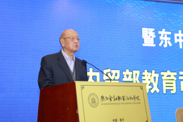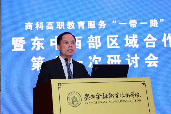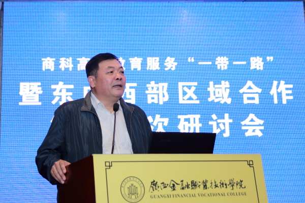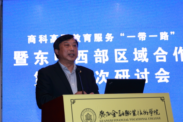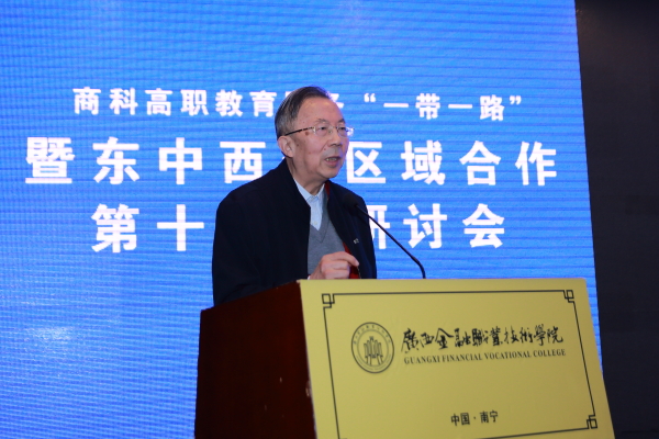 为更好服务“一带一路”建设,探索国际化发展之路,深化东中西部区域院校合作。11月29日,由中国高等教育学会职业技术教育分会主办,广西金融职业学院承办,广西经济贸易职业教育集团协办的商科高职教育服务“一带一路”暨东中西部区域合作第十一次研讨会在南宁荔园山庄举行。原内贸部教育司长、商科联盟名誉理事长王晋卿,原江苏省教育厅副厅长、国家教育咨询委员会委员周稽裘,中国高教学会职教分会会长、浙江金融职业技术学院党委书记周建松,中国职教学会商科专业委员会主任张大成,广西壮族自治区教育厅职业教育与成人教育处副处长邱金林等来自50多家单位的90余名专家、学者参加了研讨会。我院党委书记沈立君、副院长谢沛善出席会议。
