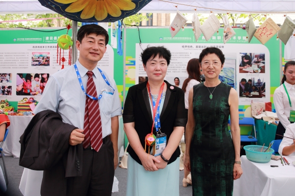 中国教育国际交流协会生建学秘书长(右)观看学生手工创意项目