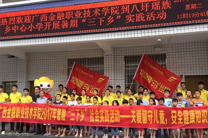 7月11日早上,南丹县八圩乡暴雨倾盆,但无法阻止betway西汉姆联官网“三下乡”志愿者们的脚步。他们不顾昨日的舟车劳顿,一大早就赶到了八圩瑶族乡中心小学,开展“关爱留守儿童,安全知识进课堂”活动。留守儿童缺乏家长监管,自我保护意识淡薄,生活环境又存在不少安全隐患。此次课堂,由我院团委卡通人物金小团通过情景模拟方式为孩子们讲解安全知识,向孩子们普及如何防拐防骗以及面临自然灾害时的自救措施,让留守儿童学会在日常生活中和突发灾害时进行正确的自我保护。金小团憨厚可掬的模样和丰富多彩的活动深深吸引了孩子们,通过互动,孩子们不仅学到了知识,还感受到了志愿者大哥哥大姐姐们的关爱。
