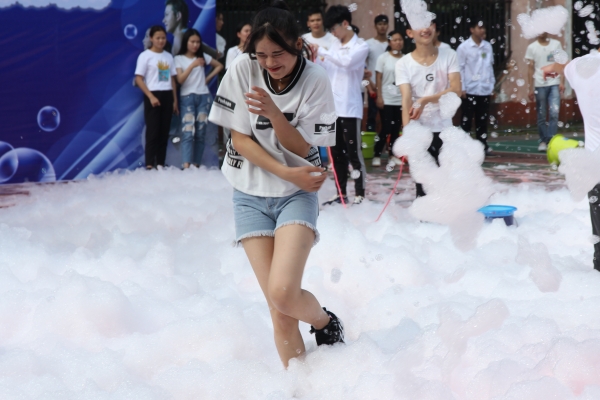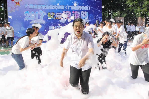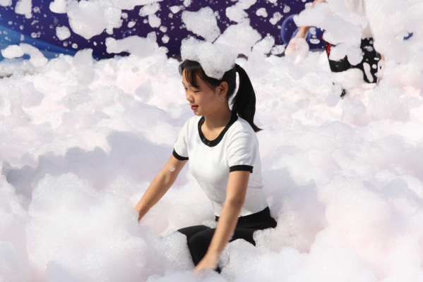 泡泡跑活动源自美国,活动使用的泡泡由纯自然椰油、可降解原料以及可食用色素制作,对身体无任何影响,安全无污染。活动当天,院团委在活动现场设置了两台超大功率的泡泡机。参赛者们身着浅色衣服,早早来到活动现场,迫不及待要参加活动。活动开始后,泡泡机不停喷涌出五颜六色的泡泡,很快布满了整个跑道。同学们在一声令下,在泡泡的海洋里沿着既定路线欢乐奔跑,尽情释放青春活力,在炎炎夏日享受一份难得的清凉。