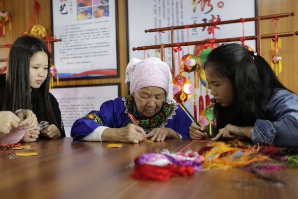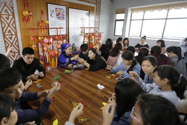 3月14至15日,“中华巧女”黄肖琴老师与其传承人赵金玉老师到我院民族文化实训基地——“中华巧女”黄肖琴壮族绣球工作室进行绣球文化传承的教学指导,手把手教授旅游管理系师生学习绣球制作。