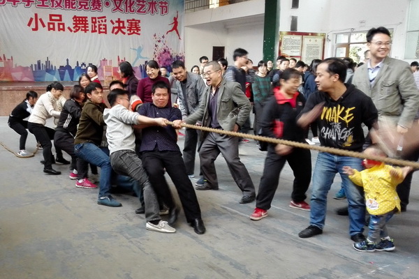 12月30日下午4点半,活动拉开帷幕。活动主要分为团体和个人两项,个人项为趣味套圈,团体项为拔河比赛。在趣味套圈活动中,工会为教职工提供了生活中亟需的小物品,如食用油、酱油、料酒、饮料等。这项活动吸引了广大教职工的积极参与,大家排起了长龙来一试手气。拔河比赛以工会小组为单位进行分组,9个工会小组经过预赛、决赛的两轮角逐,最后评选出一等奖3名,二等奖3名,三等奖3名。拔河比赛不仅让教职工活动了筋骨,也使团队合作精神得到了极大的提升。没有参加拔河比赛的教职工也在一边为自己工会小组加油鼓劲、呐喊助威,活动现场充满着热情洋溢的氛围。