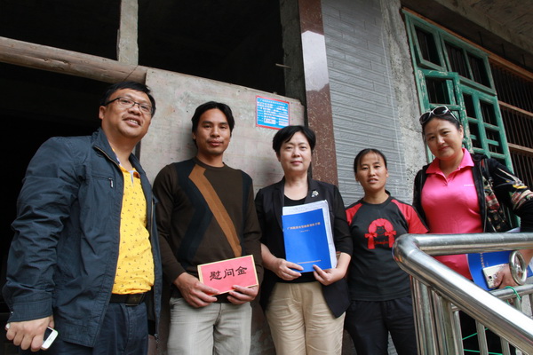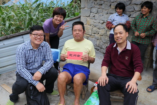 各小分队驱车深入村屯,爬山越岭,到贫困户家中发放米、食用油和慰问金,与群众促膝座谈,了解群众的难处;对家里有上学的儿童、青少年,给予高度的人文关怀,了解学习情况、政策享受情况,鼓励他们用知识改变自己和家庭的命运;对有山上落石威胁房屋的村民,做好安全宣传和救灾的相关知识普及工作。