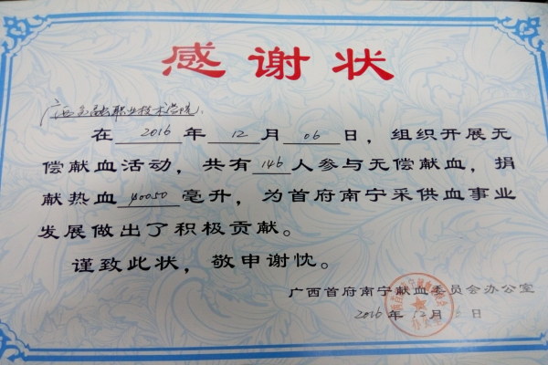 据统计本次献血活动前来参加献血的人数达到146人,累计献血量达到40050毫升。同时,广西首府南宁献血委员会办公室在活动结束后为我院颁发了感谢状,对我院师生在活动中作出的贡献表示崇高的敬意和衷心的感谢。