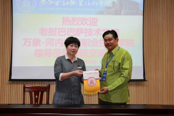 会谈结束后,我院与老挝万象-河内友谊技术职业学院共同签署了合作协议。同时,我院与巴巴萨技术学院、老挝万象-河内友谊技术职业学院互赠了校旗。