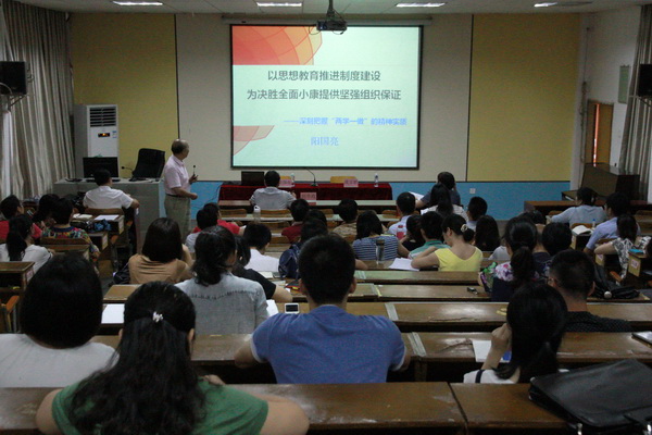 为了深入学习贯彻习近平总书记关于“两学一做”学习教育工作的重要指示精神,切实加强我院全体党员的政治理论学习,提升党性修养,推动学院各项工作健康快速发展,6月21日下午,我院在电一召开“两学一做”学习教育专题辅导报告会。会议邀请了广西大学原党委书记、广西大学区域发展研究院院长、广西大学旅游科学研究院院长、广西壮族自治区决策咨询委员会咨询专家、二级教授、博士生导师阳国亮教授来给大家作题为处“以思想教育推进制度建设,为决胜全面小康提供保证——深刻把握´两学一做´的精神实质”专题辅导报告。学院院长沈立君,党委副书记、纪委书记刘华政,副院长谢沛善及全体党员、预备党员、入党积极分子参加本次会议。沈院长主持会议。