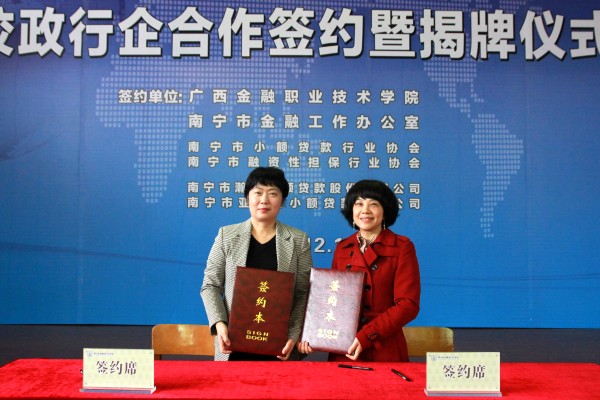 随后,沈立君院长代表学院分别与南宁市金融办、南宁市小额贷款行业协会、南宁市融资性担保行业协会、南宁市瀚华小额贷款有限公司、南宁市亚联财小额贷款有限公司签约并揭牌。中国小额信贷联盟秘书长白澄宇做了题为“互联网时代小贷公司创新与发展”的形势报告。