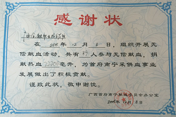 广西首府南宁献血委员会办公室对我院此次无偿献血活动密切关注,并在活动结束后为我院颁发了感谢状,对我院师生在活动中作出的贡献表示崇高的敬意和衷心的感谢。