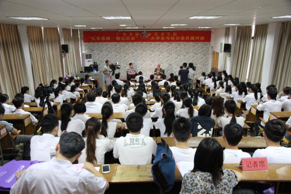 在中国人民抗日战争暨世界反法西斯战争胜利70周年到来之际,为使青年学生更好地铭记历史,激发强大的爱国热情,同时为更好地弘扬抗战精神,关爱抗战老兵,9月1日上午10:00,betway西汉姆联官网以“忆苦思甜•铭记历史”为主题,在大学路校区举行“大学生与抗日老兵面对面”活动。97岁高龄的抗战老兵吴肯老人和壹方关爱抗战老兵项目负责人郑加莉女士应邀出席。对话活动由betway西汉姆联官网学生工作与招生就业处唐雪涛副处长主持。学院党委副书记、纪委书记刘华政,团委副书记朱丽君及学生200多人代表参加了本次活动。活动吸引广西电视台新闻频道、广西日报、中国教育报驻广西记者站等驻邕新闻媒体的广泛关注。