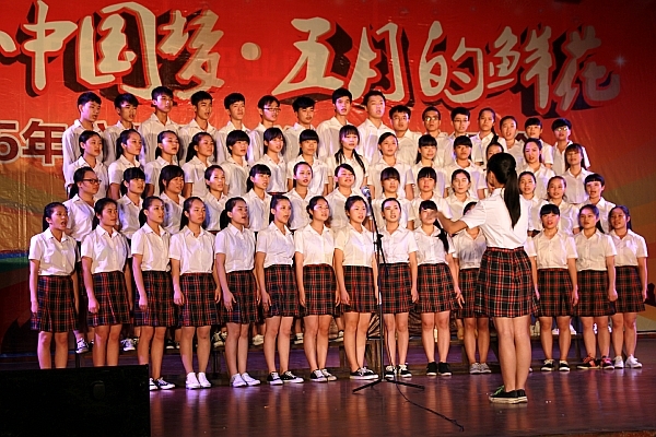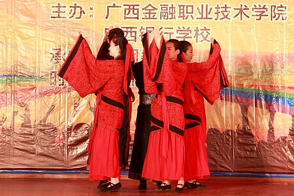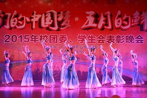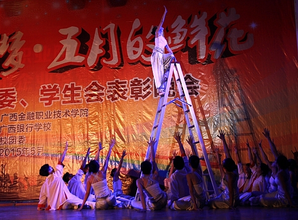 伴随着庄严雄壮的《光荣啊,中国共青团》合唱,晚会进入了文艺演出环节。激情的演唱、优美的舞蹈、感人的朗诵、独特的礼仪展示、动听的萨克斯独奏赢得了观众的阵阵掌声。大专部学生带来的舞蹈节目《攀》,以精湛的演绎水平、独特的表演形式及震撼人心的舞台效果淋漓尽致地表达了青年追求梦想、超越自我、相爱互助的精神,将整场晚会推向了高潮。
