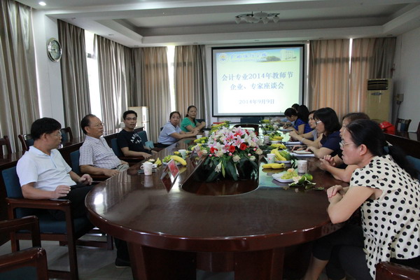 9月9日下午,为庆祝第三十个教师节,作为庆典活动之一的“会计专业教师与行业专家座谈会”在西汉姆联五楼会议室隆重举行。此次应邀出席本次座谈会的行业专家分别有:广西南宁市农业银行办公室主任韦业宏;广西金汇财务管理公司总经理黄正璋;广西中智财会服务公司总经理黄隽梅;广西南宁驰骋电子科技有限公司经理刘俊峰;广西南宁市农村信用合作社上尧分行副主任郭蓓。会议由会计系张红梅老师主持。