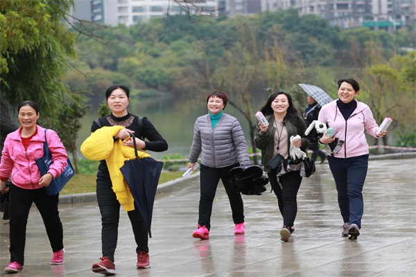三月春雨绵绵,但女职工们热情高涨,伴着朦朦细雨,夹着缕缕春风,沿着湖畔,走过湖堤,行走在春色满园的相思湖,一路上你追我赶,欢声笑语,给相思湖增添了几分活力与生机。通过健步走活动, 让女职工强身健体,以良好的身体素质和饱满的精神风貌投入到工作、学习和生活中去,更好地为学校发展贡献自己的力量。