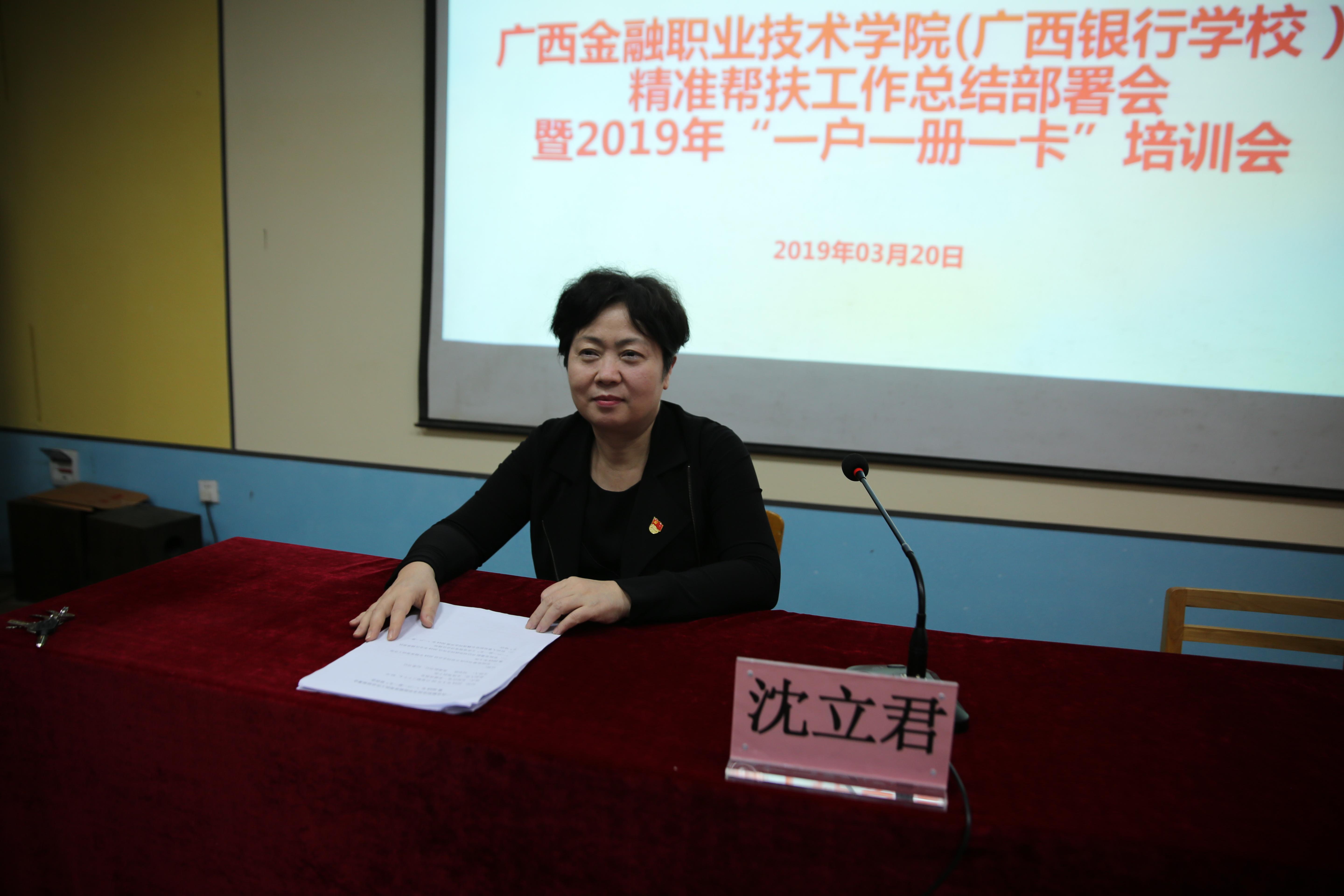 会上,学院党委书记沈立君同志总结了我院2018年精准扶贫工作,在肯定精准扶贫工作取得成效的同时,指出存在的问题和不足,并就我院2019年精准帮扶工作进行了部署安排。沈书记指出,广大干部要充分认识精准扶贫工作的重要意义,坚决把思想和行动统一到中央、自治区决策部署上来,以强烈的政治意识聚焦脱贫攻坚任务,精准发力,狠抓落实。就下一步工作开展提出四点要求:一是要做好“一户一册一卡”发放和登记工作,确保贫困户及时拿到手册;二是要持续抓好精准帮扶工作,进一步压紧压实工作责任;三是加强宣传教育,激发贫困群众的内生动力;四是加大对第一书记的关心和支持,切实为他们创造好工作条件。