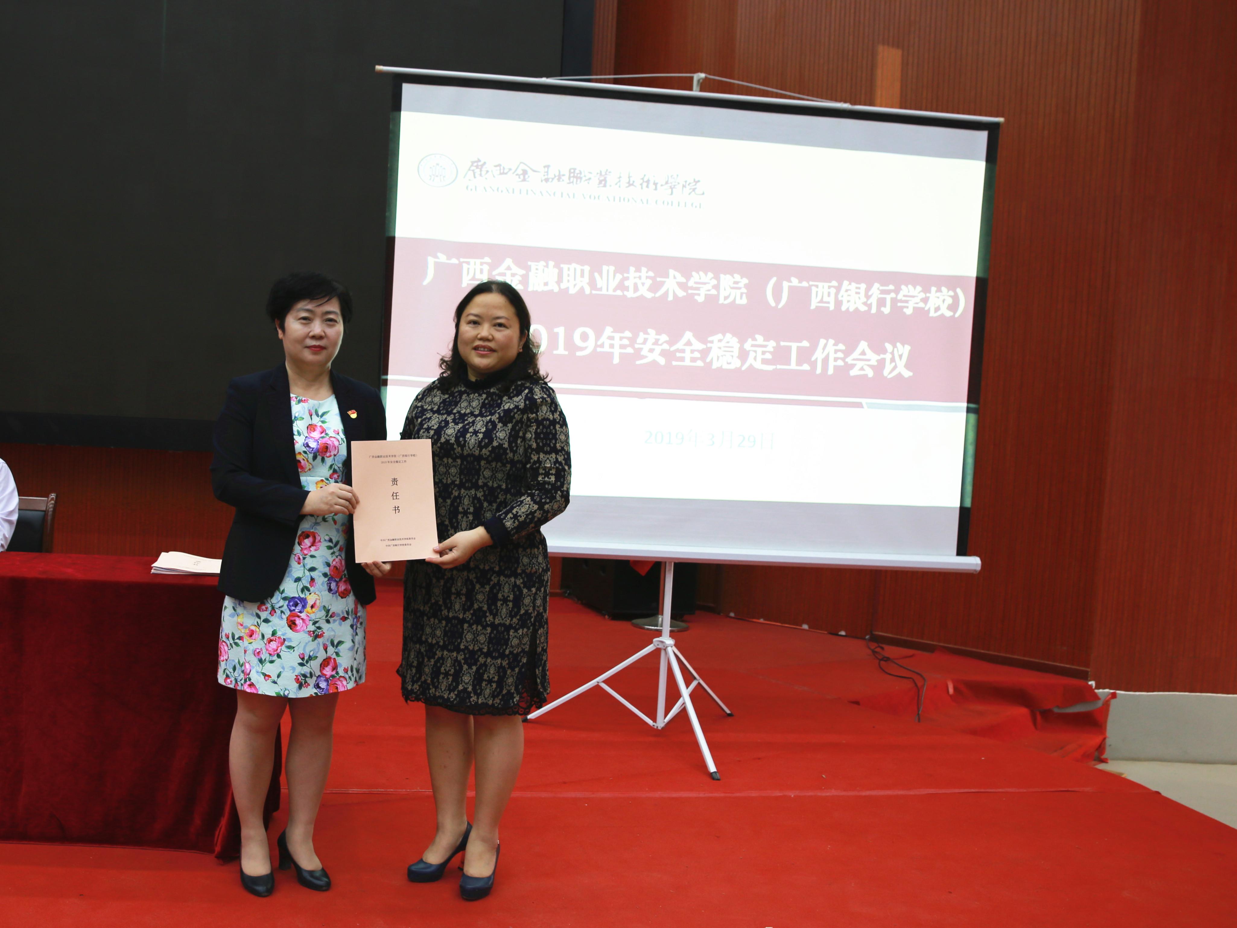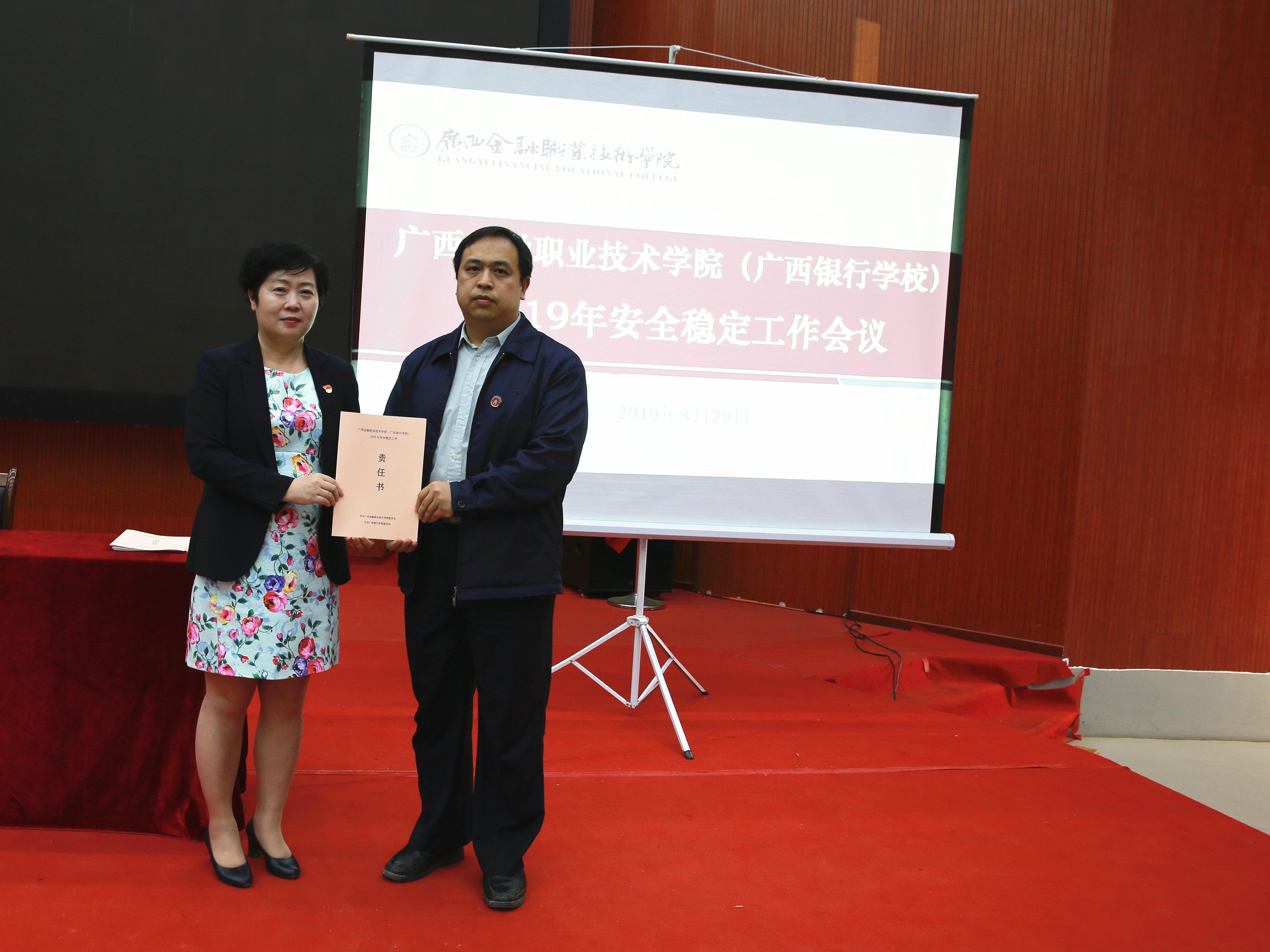 会议伊始,由各部门负责人依次向学校党委递交《2019年安全稳定工作责任书》。随后,后勤管理与保卫处、学生工作招生就业处、教务科研处负责人作为代表在会上进行了校园安全稳定工作经验交流。