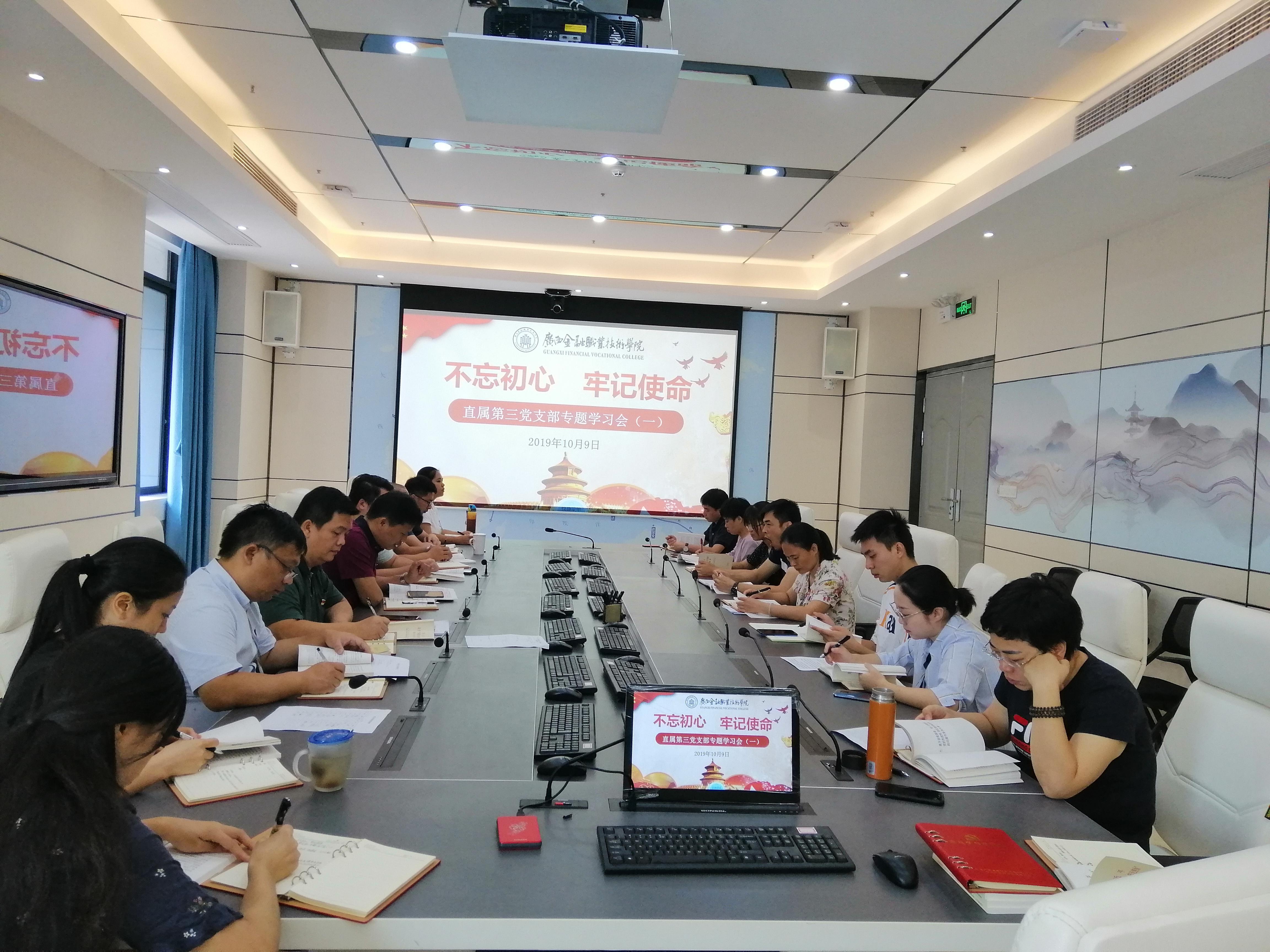10月9日,直属第三党支部在西校区行政办公楼103会议室开展“不忘初心、牢记使命”主题教育第一专题研讨学习会。本次学习会参加对象为支部党员与预备党员,学院党委副书记刘华政以普通党员身份参加并作研讨发言,研讨学习会由直属第三党支部书记周海峰同志主持。