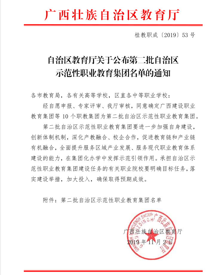 11月2日,广西壮族自治区教育厅下发《自治区教育厅关于公布第二批自治区示范性职业教育集团名单的通知》(桂教职成〔2019〕53号),西汉姆联申报的“广西经济贸易职业教育集团”获批为第二批自治区示范性职业教育集团。