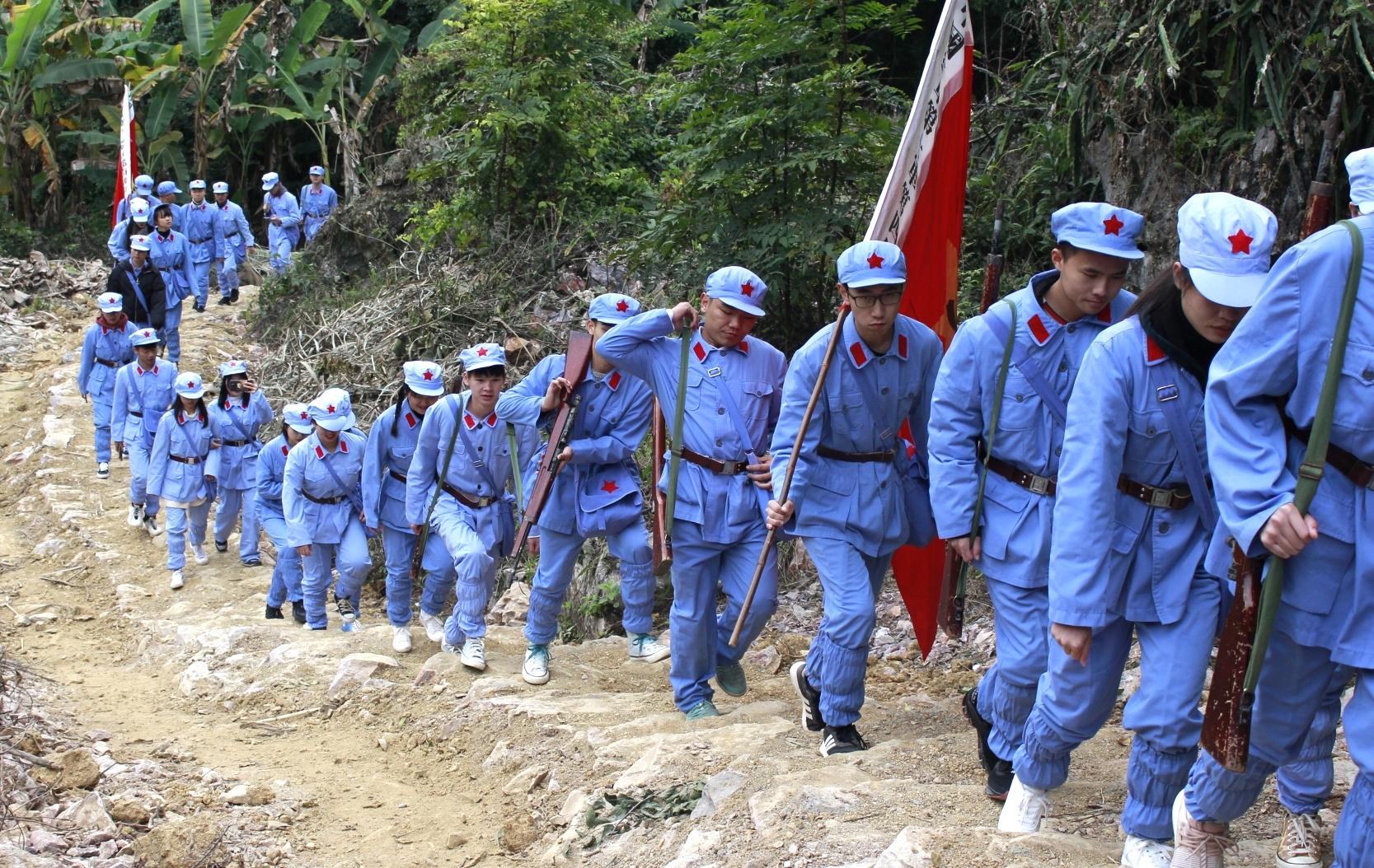 田东,是一片有着光荣革命历史的红土地,是邓小平等老一辈无产阶级革命家踏上右江地区第一脚、打响百色起义第一枪的地方,是广西第一块红色政权——右江苏维埃政府所在地。来到田东县思林镇真良村,编队整训授旗授枪仪式后,学员们开启实践教学第一程——重走运枪小道。扛着红旗沿着陡峭石壁挺进,背着长枪踏着蜿蜒山路前行,感受红军在陡峭的小道上运载武器的艰辛。学员们重走这段崎岖山路,在最为泥泞艰险的运枪小道上,一边行进,一边弯着腰传着口令,还时不时地前后照应,艰难跋涉两公里,歌声飘扬两公里,依然斗志昂扬。
