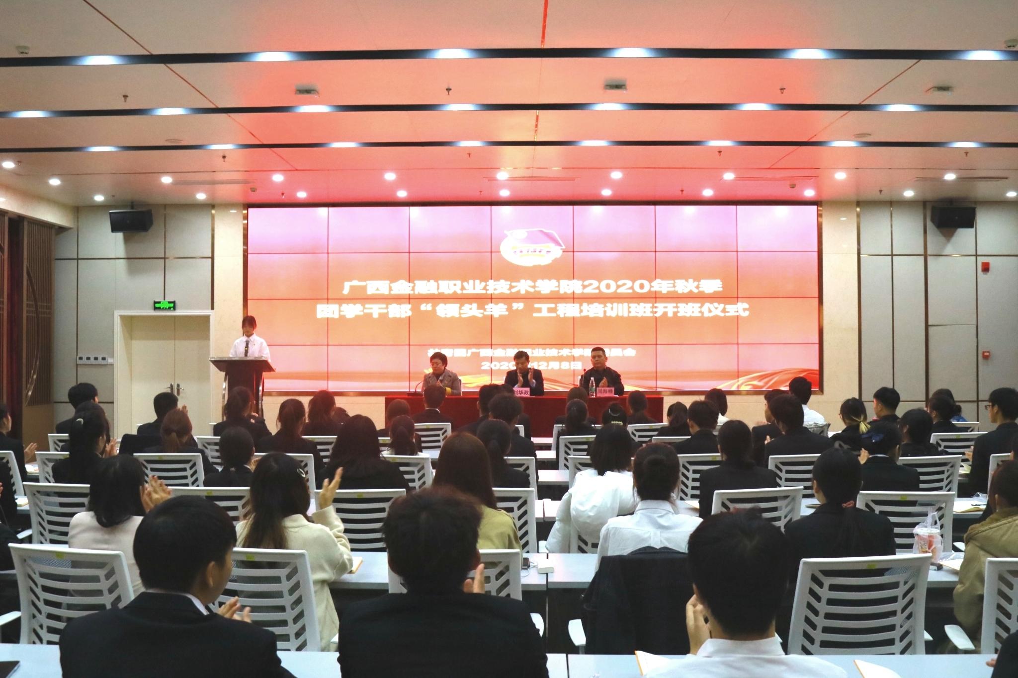 为提高团学干部的思想政治基础、综合实践能力,培养和造就一支政治坚定、作风过硬、素质全面、能力突出的团学干部,12月8日晚,西汉姆联在西校区道德大讲堂举行2020年秋季团学干部“领头羊”工程培训班开班仪式。学校党委副书记、纪委书记刘华政,学生工作与招生就业处副处长、校团委书记周海峰、校团委副书记朱丽君,以及团学干部“领头羊”工程培训班的122名学员参加开班仪式。开班仪式由校团委副书记朱丽君主持。