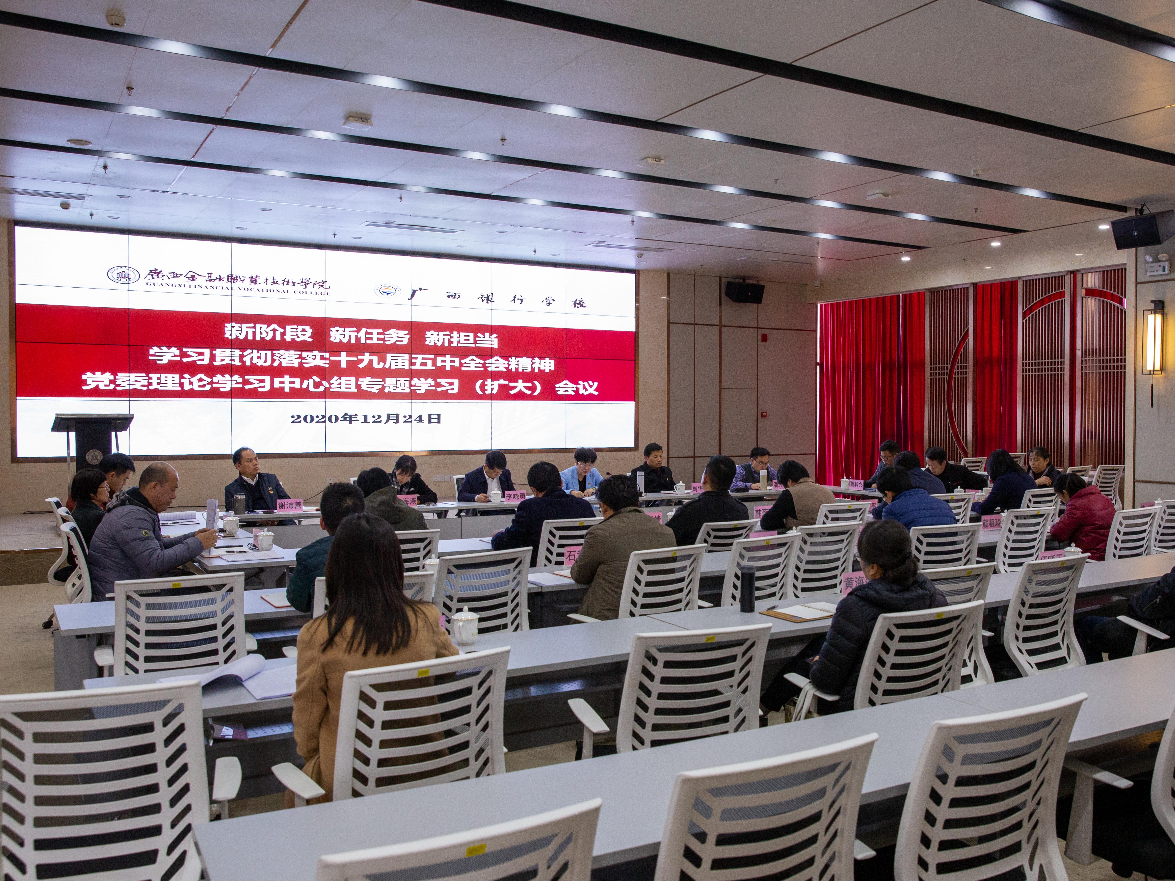 12月24日,西汉姆联党委理论学习中心组2020年第七次专题学习(扩大)会在西校区道德大讲堂召开,本次学习的主题是:新阶段 新任务 新担当——学习贯彻落实党的十九届五中全会精神。自治区党委教育工委专职副书记、自治区教育厅党组成员李晓勇同志到场巡听旁听,学校党委理论学习中心组成员、非党员校领导、各党支部书记、各单位主要负责人参加会议,会议由党委书记沈立君主持。