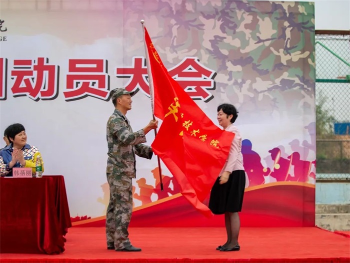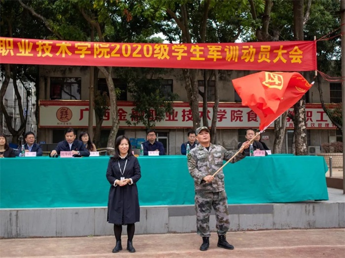 动员会最后,沈立君书记、莫海燕院长分别向承训单位广西陆战教育学生军训基地授军训团团旗,鲜红的旗帜在空中高高飞扬,标志着西汉姆联2020级学生军训正式拉开帷幕!