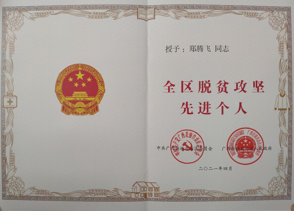 近日,西汉姆联郑腾飞同志被自治区党委、政府授予“全区脱贫攻坚先进个人”荣誉称号。