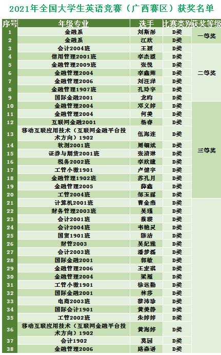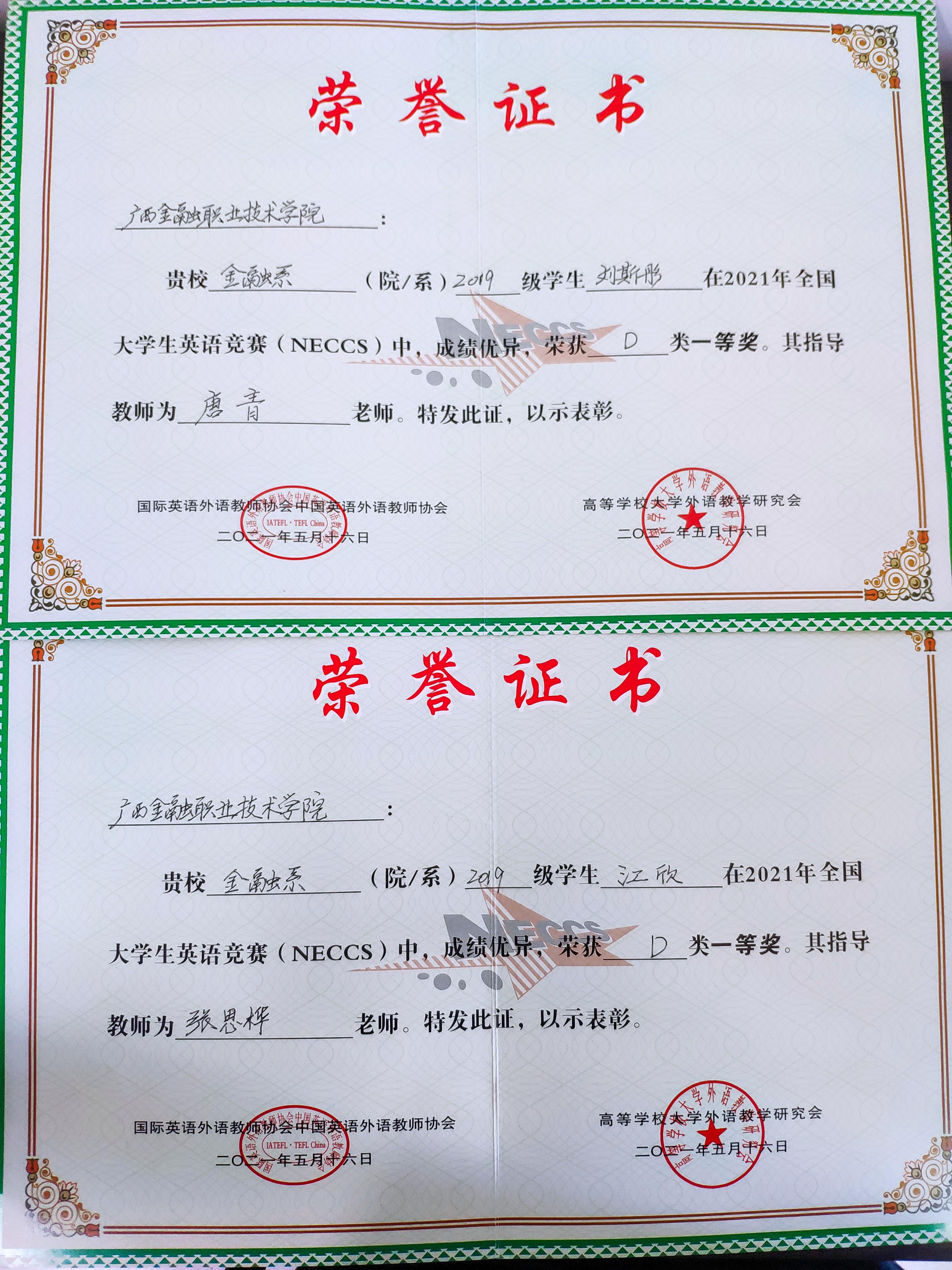 近日,全国大学生英语竞赛组委会传来喜讯,西汉姆联学子在2021年全国大学生英语竞赛中表现优异,荣获佳绩。其中,金融系刘斯彤、江欣两位同学获得了全国大学生英语竞赛广西赛区一等奖的好成绩;王颖、李杰霞等7位同学获得了广西赛区二等奖,邓义婷、何美等11位同学获得了广西赛区三等奖,曹金燕、张耀元等56位同学获得了广西赛区优胜奖。西汉姆联公共基础部教师唐青、张思桦荣获优秀指导教师奖,学校荣获优秀组织奖。