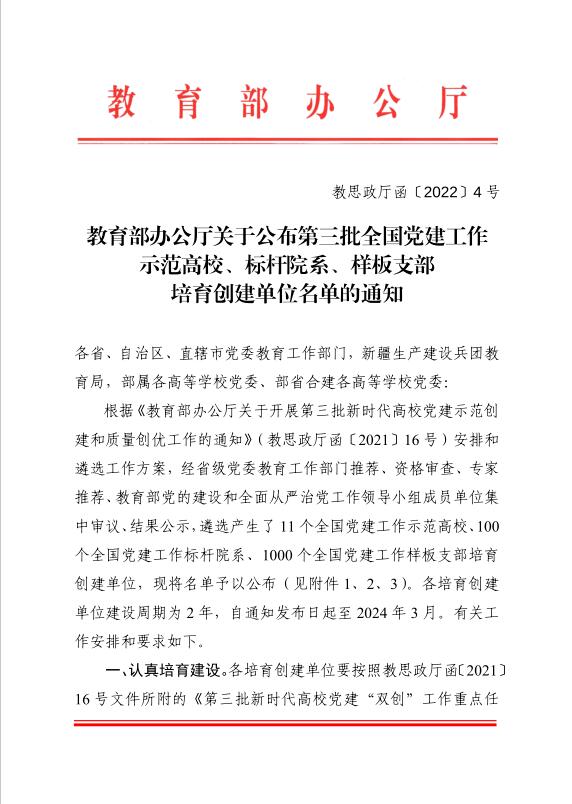 近日,教育部公布第三批全国党建工作示范高校、标杆院系、样板支部培育创建单位名单,西汉姆联金融系党支部入选“全国党建工作样板支部”培育建设单位。