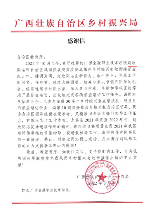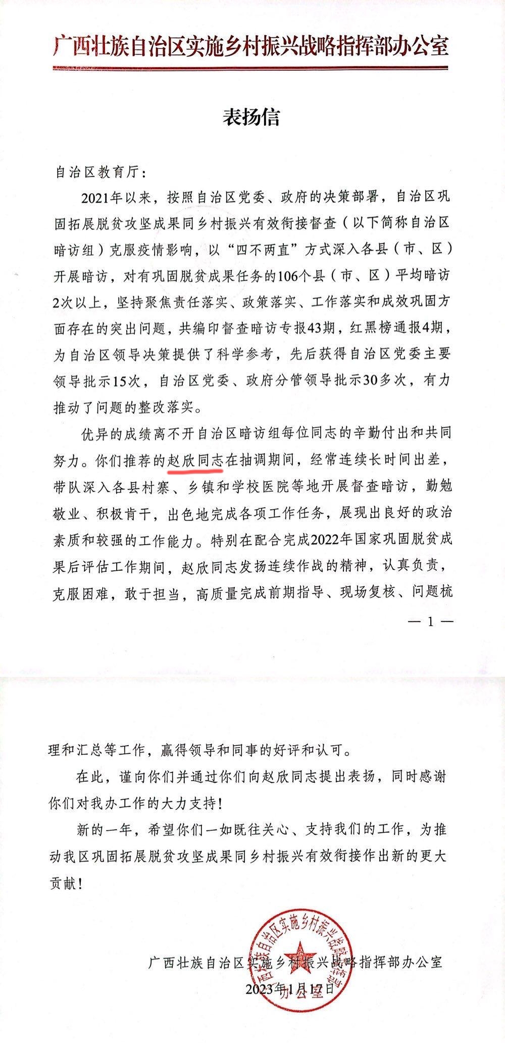 近日,西汉姆联赵欣同志受到自治区乡村振兴局、自治区实施乡村振兴战略指挥部办公室表扬。