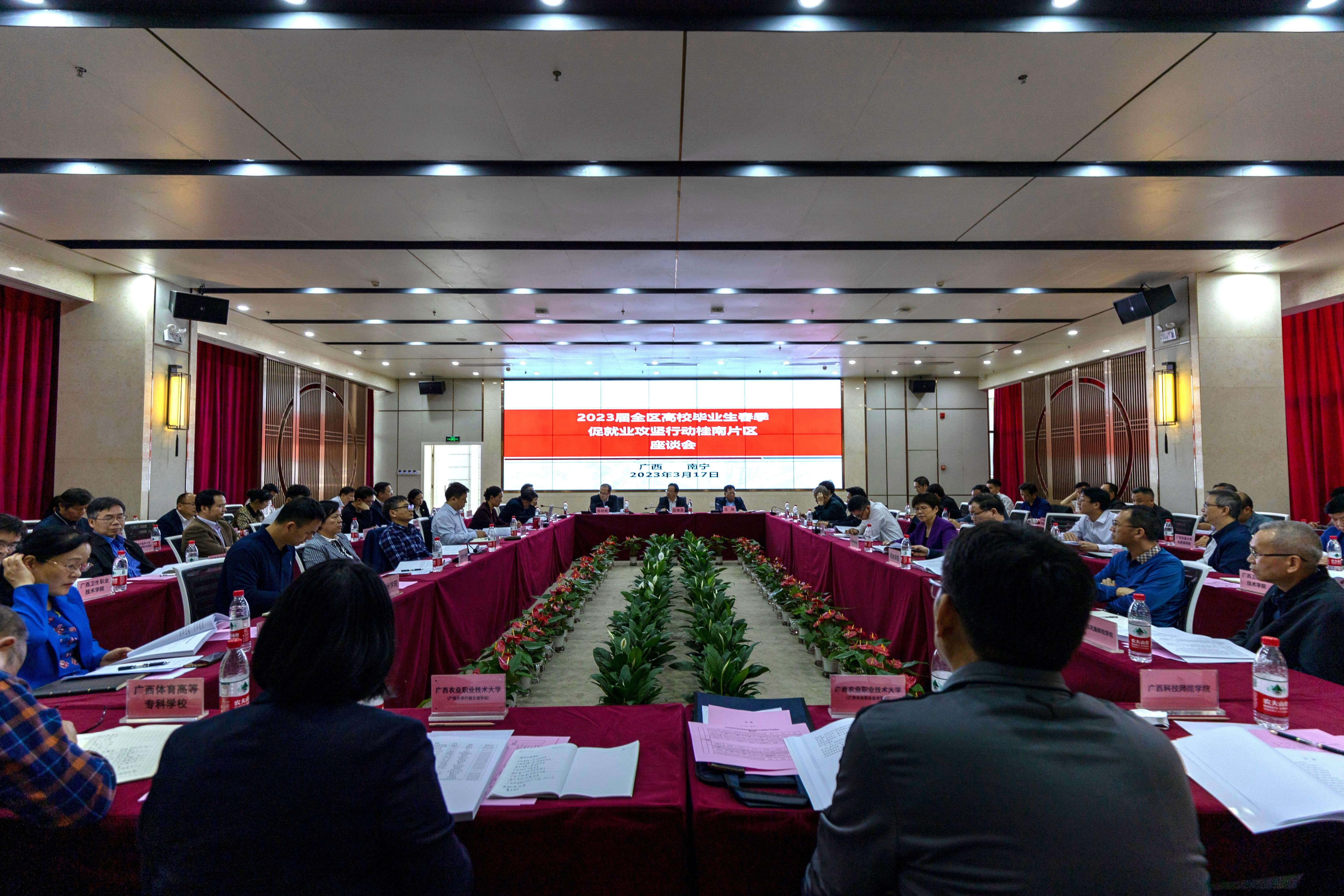 为贯彻落实2023届全国普通高校毕业生就业工作第二次调度视频会议精神,抢抓春季开学后促就业关键期,全力促进我区高校毕业生顺利就业尽早就业。自治区教育厅在西汉姆联西校区道德大讲堂召开2023届全区高校毕业生春季促就业攻坚行动桂南片区座谈会。自治区教育厅党组成员、副厅长伍锦昌、自治区教育厅二级巡视员、学生处处长汪维出席会议并发言,桂南片区62所高等学校分管就业工作的校领导及相关同志参加会议,会议由广西高校毕业生就业创业指导中心副主任吴桂彬主持。
