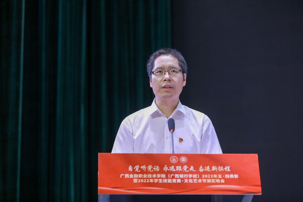 在致辞中,李高岩书记对广大青年师生提出殷切希望:一是要坚定理想信念,做有理想的新时代青年;二是要锤炼过硬本领,做有本领的新时代青年;三是要弘扬时代精神,做有担当的新时代青年。李书记勉励广大金院青年筑牢信仰之基,汲取奋进之志,以实际行动为为建设壮美广西、实现中华民族伟大复兴,加快学校建成“金融行业人才培养特色鲜明、位居国内同类院校先进行列”的广西高水平高职学校贡献青春力量。