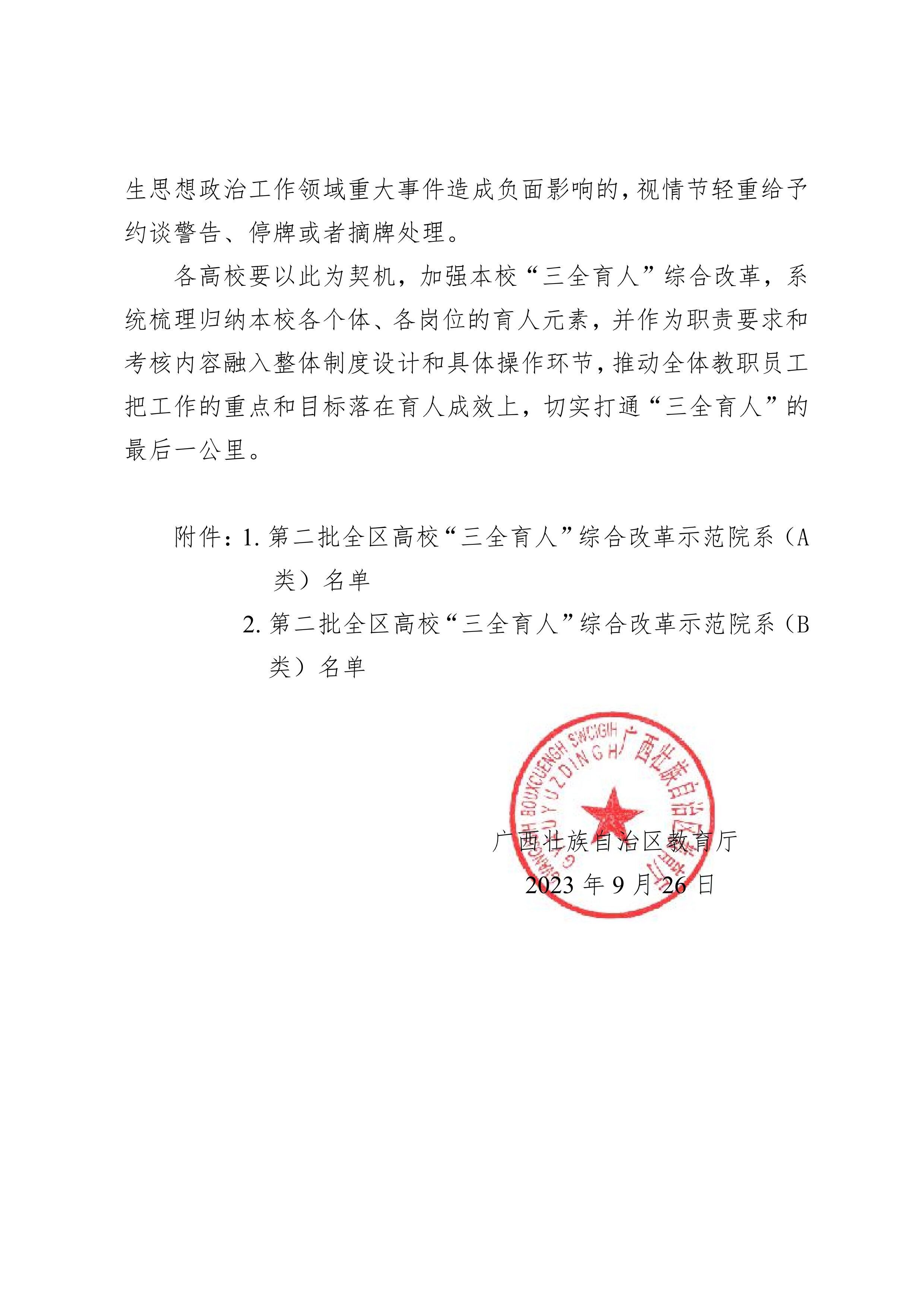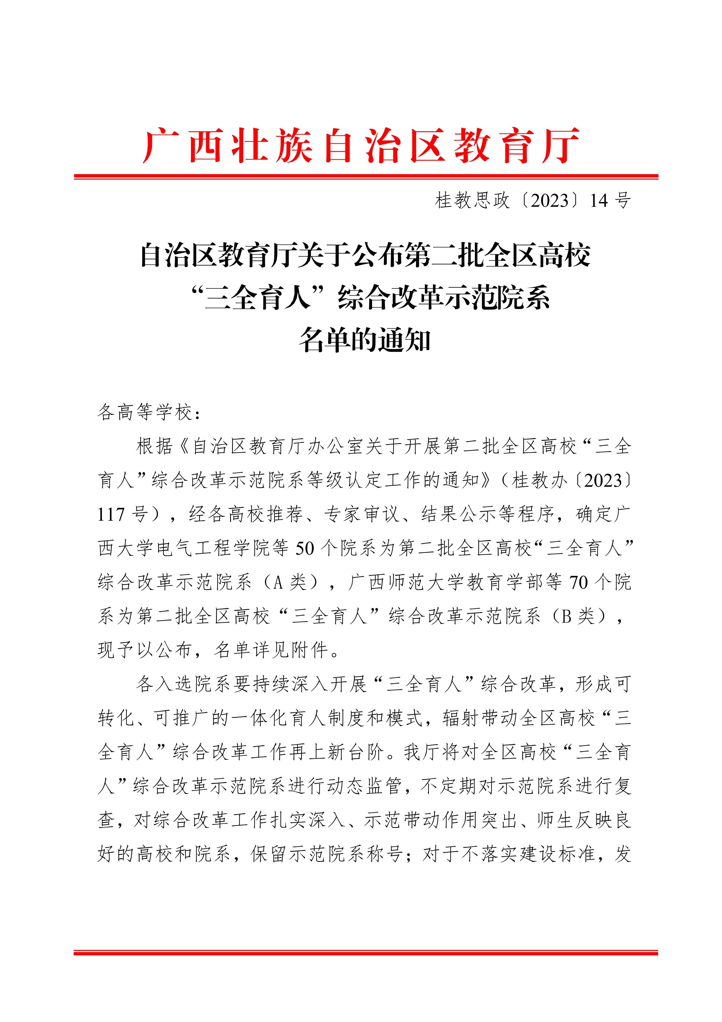 据悉,自治区高校“三全育人”综合改革示范院系评选根据《自治区教育厅办公室关于开展第二批全区高校“三全育人”综合改革示范院系等级认定工作的通知》(桂教办〔2023〕1117号),经高校推荐、专家审议、结果公示等程序而最终确定,旨在以习近平新时代中国特色社会主义思想为指导,坚持和加强党对教育的全面领导,落实立德树人根本任务,推动构建全员协同、全程覆盖、全方位渗透、职业教育特色突出的育人体系,形成思想价值引领贯穿教育教学全过程和各环节的长效机制。