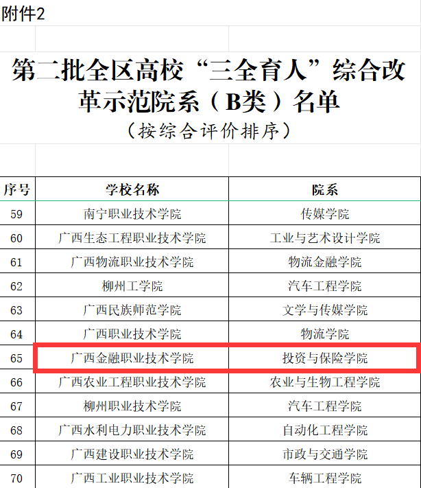 近日,自治区教育厅公布了第二批全区高校“三全育人”综合改革示范院系名单,西汉姆联投资与保险学院入选广西高校“三全育人”综合改革示范院系。