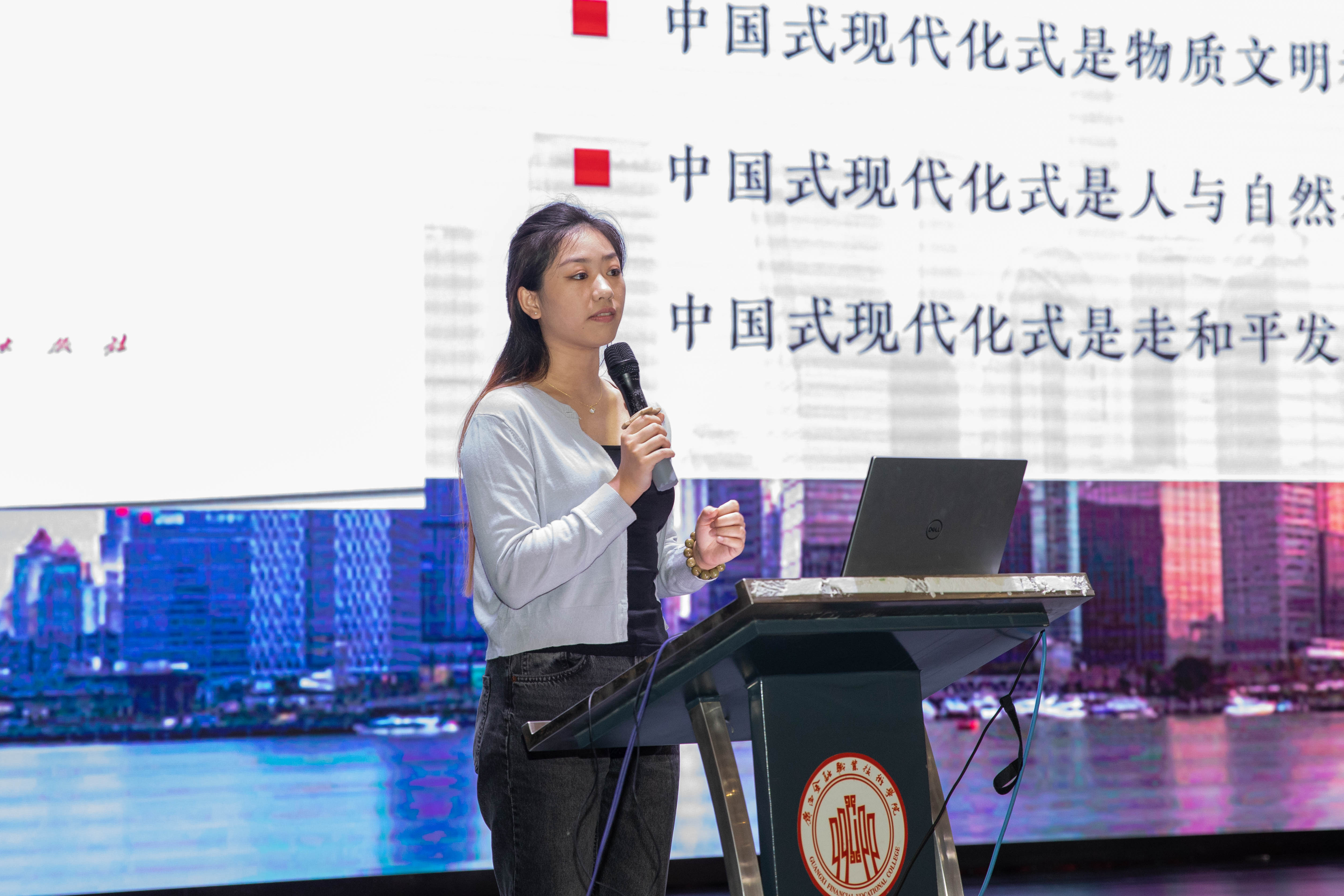 宣讲中,黄振宣教授以《以梦为马,不负韶华——以青春之我为中国式现代化添彩助力》为题,回顾了中华民族求索现代化的艰难历程,阐释了中国式现代化深刻内涵,为帮助同学们坚定道路自信、树立远大梦想提供了重要的精神动力。马梦瑶同学立足乡村振兴的重大战略背景,结合家乡发展变化历程,以《让有风的地方乘风而上》为题,讲述了乡村振兴规划、乡村旅游、乡村教育的“成色”“特色”和“底色”,反映了当代青年在强国时代的学思践悟。潘玥亦同学“解码人口规模巨大的中国式现代化”,用数据变化彰显其实施广度和为民温度,同时传递“夯实技能本领、磨砺技能成才、投身技能报国”的正能量,展现了职教学子“强国复兴有我”的责任与担当。