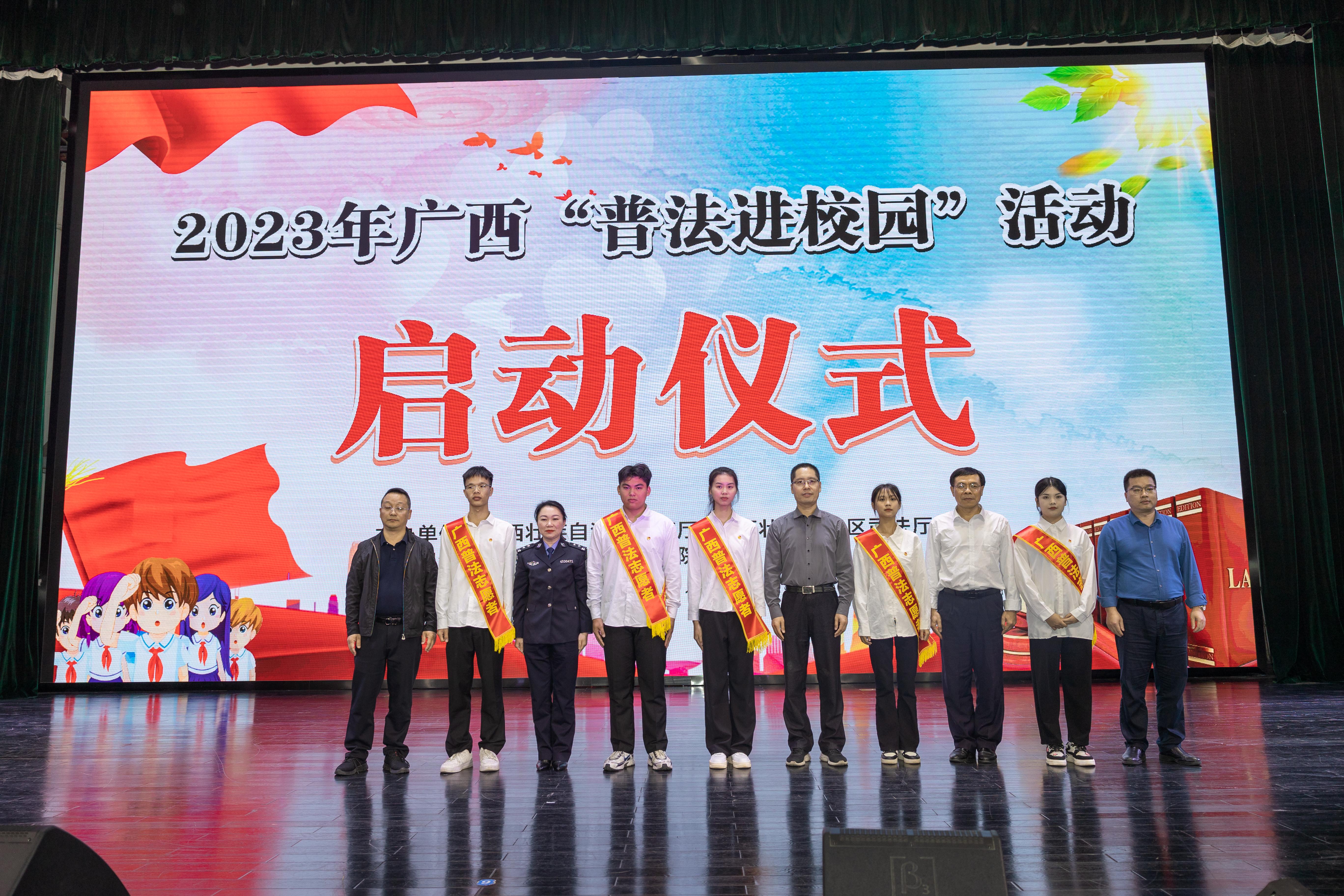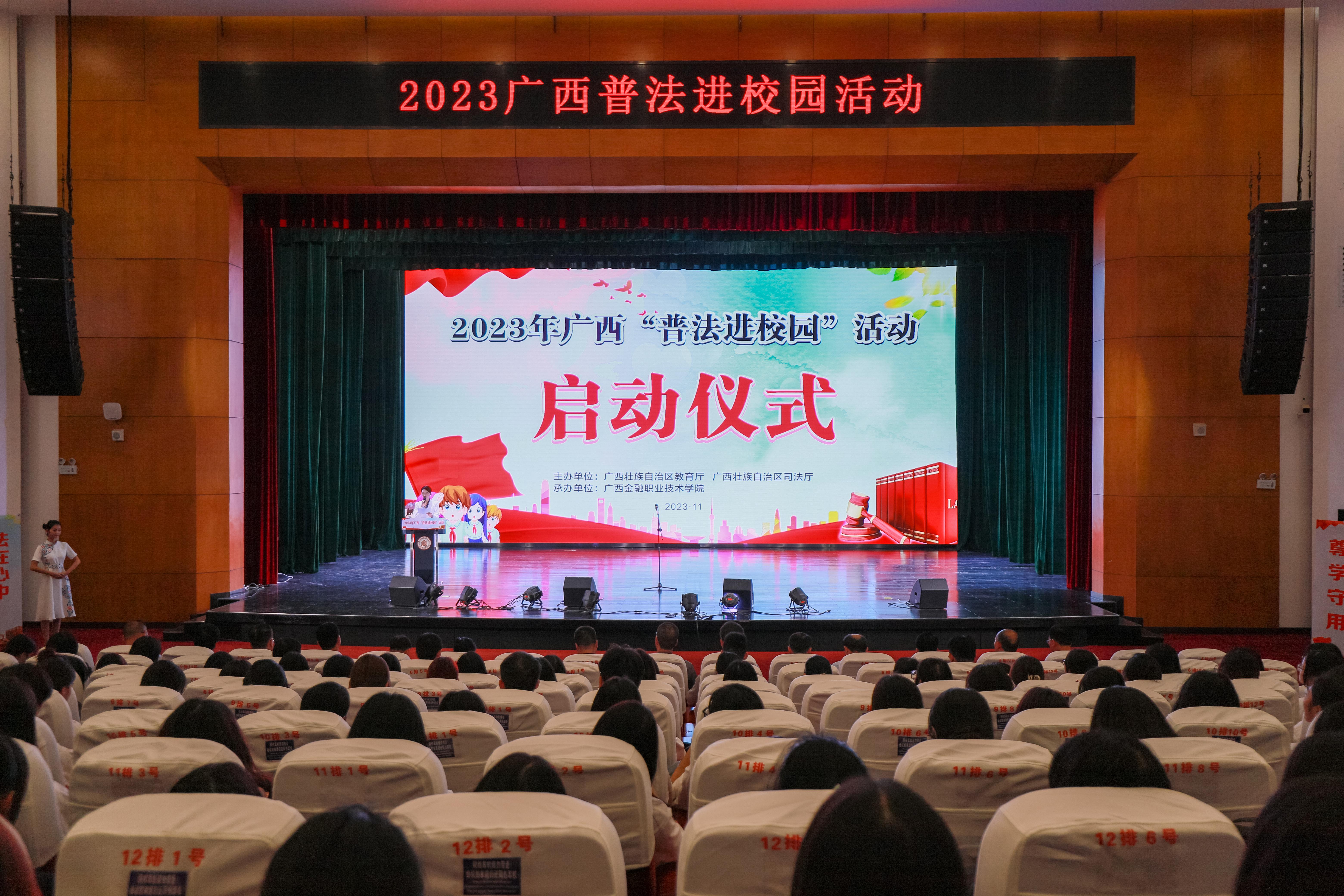 为全面学习贯彻党的二十大精神,营造尊法、学法、守法、用法的良好法治浓厚氛围,推动青少年法治教育常态化长效化,11月23日下午,由自治区教育厅、自治区司法厅主办,广西广播电视台承办、广西职业技术学院等10所中高职学校协办的2023年“普法进校园”主题活动启动仪式在西汉姆联西校区国际会议中心成功举办。自治区教育厅政策法规处处长李辉善、自治区司法厅普法与依法治理处处长陆建武、广西广播电视台青少年普法栏目组人员、协办单位学校代表等出席启动仪式。