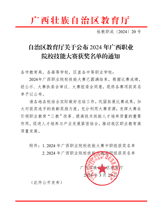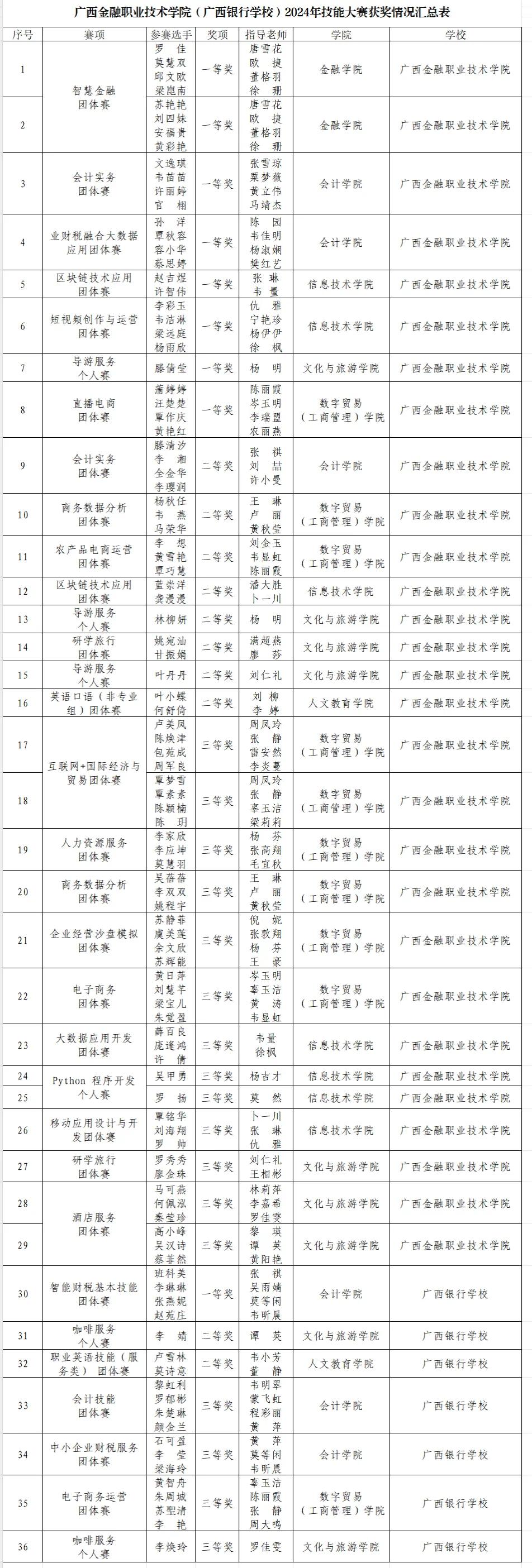 近日,由广西壮族自治区教育厅主办的2024年广西职业院校技能大赛圆满落幕。本次大赛学校共选派出131名选手参加34个赛项的角逐,根据自治区教育厅公布的获奖名单,西汉姆联获奖数量共36项,获奖人数102人,获奖率达到77.86%,获奖总数创历史新高。其中,高职组一等奖8项,中职组一等奖1项;高职组二等奖8项,中职组二等奖3项;高职组三等奖13项,中职组三等奖3项,同比增长33.33%。区块链技术应用、业财税融合大数据应用、会计实务、短视频创作与运营、直播电商、导游服务、智能财税基本技能赛项各获赛项各获一等奖1项,智慧金融赛项获得一等奖2项。