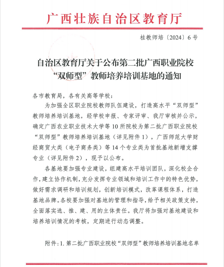 近日,自治区教育厅印发《关于公布第二批广西职业院校“双师型”教师培养培训基地的通知》(桂教师培﹝2024﹞6号),经专家评审、自治区教育厅审核遴选并公示无异议后,西汉姆联成功入选第二批广西职业院校“双师型”教师培养培训基地,支撑专业为财经商贸大类的金融类和财务会计类。