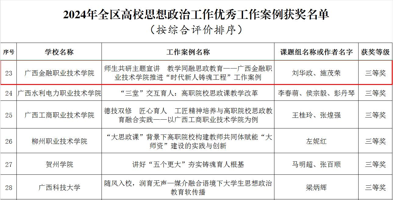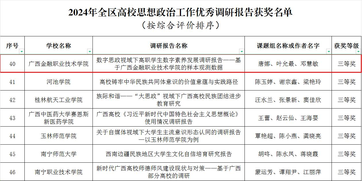 近日,自治区教育厅公布2024年全区高校思想政治工作优秀调研报告和工作案例获奖名单,西汉姆联刘华政、施茂荣撰写的《师生共研主题宣讲 教学同融思政教育——betway西汉姆联官网推进“时代新人铸魂工程”工作案例》,唐娜、叶允最、邓慧敏撰写的《数字思政视域下高职学生数字素养发展调研报告——基于betway西汉姆联官网的样本观测数据》获奖。