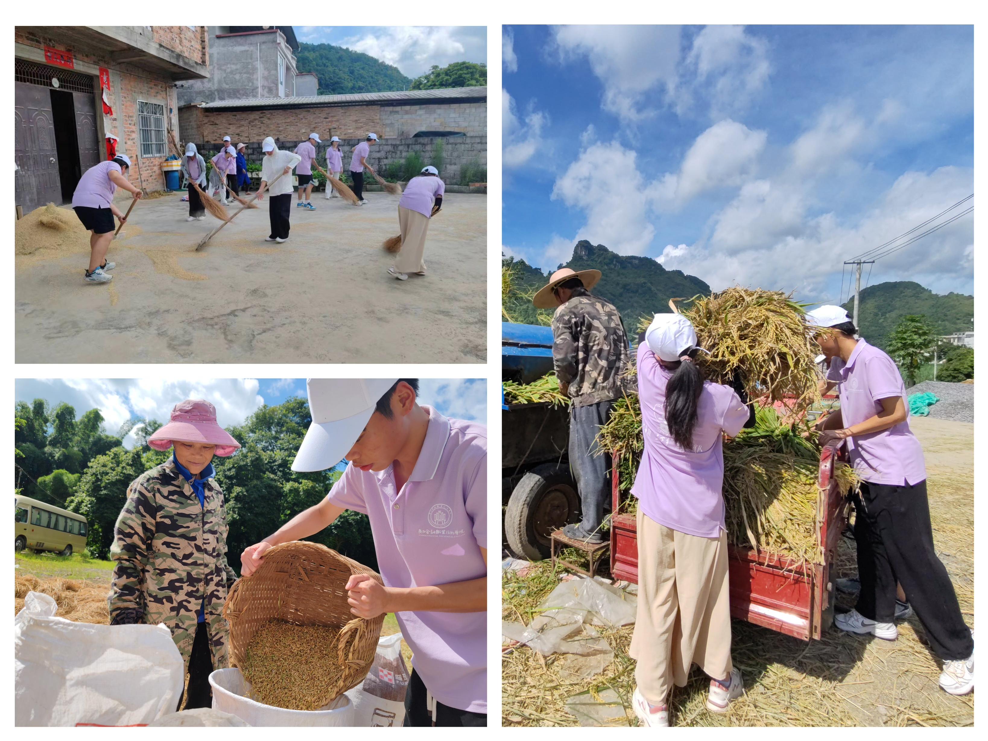 7月14日,实践团在榄圩乡斌屯进行助农志愿服务实践活动。为支援斌屯村缺少劳动力的农户家庭抢收稻谷,充分发挥青年学子的责任担当精神。帮助农户水稻脱粒和收晒稻谷,见证了师生合力践行习近平总书记对青年的嘱托,为乡村振兴贡献青春力量,让青春在为祖国、为人民、为民族、为人类的奉献中焕发出更加绚丽的光彩!